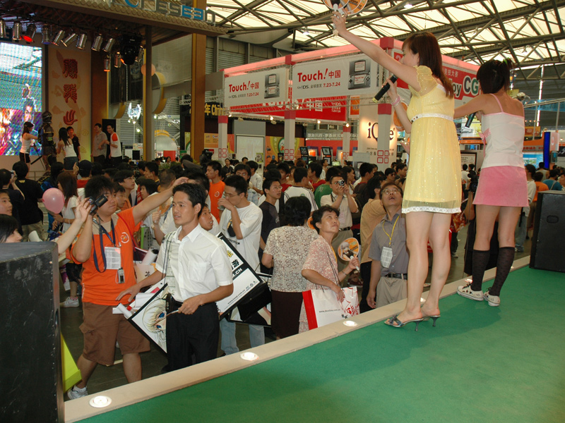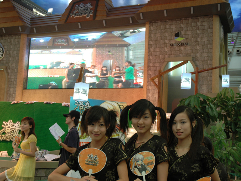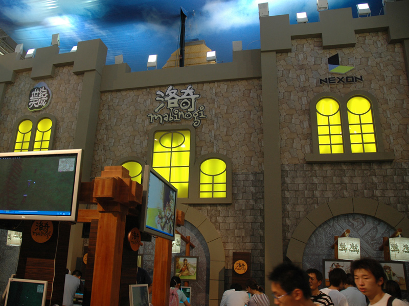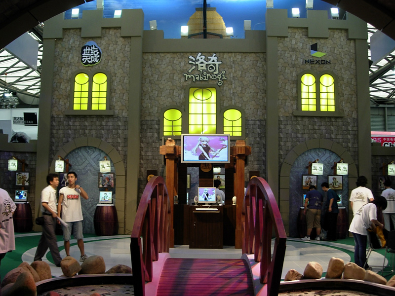今天(7月21日)一早,上海新国际博览中心2号馆2006《洛奇》展台已经围满了热情的玩家。整个《洛奇》展台是由游戏里的场景组合而成的,前台是由“迪尔科内尔”中的广场高台和学校建筑组成,后台是由敦巴伦中的建筑为主,是玩家的游戏区和比赛区。