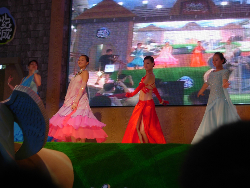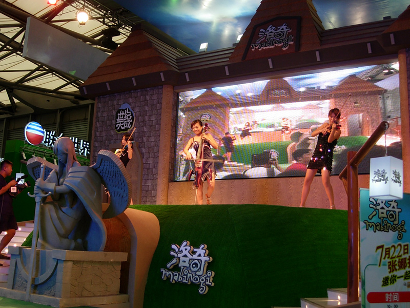 大家在经过有序的排队之后,每个人都手提着娜儿发送的礼品包,围着前台注视着展台上的女神像,殷切的期待着女神的降临。10点整,伴着场景的变幻,主台上女神像座基大门缓缓开启,女神降临人间!整个展区沸腾了起来。这时主持人走了出来,介绍《洛奇》的展台和全天活动、奖品,欢迎各位来宾来到洛奇的世界。接着由三人女子提琴表演的“爱琳之歌”,更是完全调动了现场的气氛,把人潮都吸引了过来。